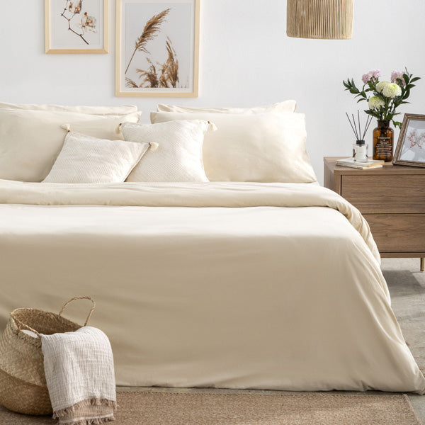 Yıkanmış pamuk ve keten karışımından üretilen bu nevresim seti, doğal kırışıklıklar ve nostaljik bir görünümle şıklık sunuyor. Oeko-tex 100 sertifikalı kumaşı, cildinize zarar vermezken, terletmeyen ve yumuşak dokusuyla konfor sağlıyor. Çift kişilik nevresim ve 2 adet yastık kılıfından oluşan set, yatak odanıza huzur ve zarafet katacak.