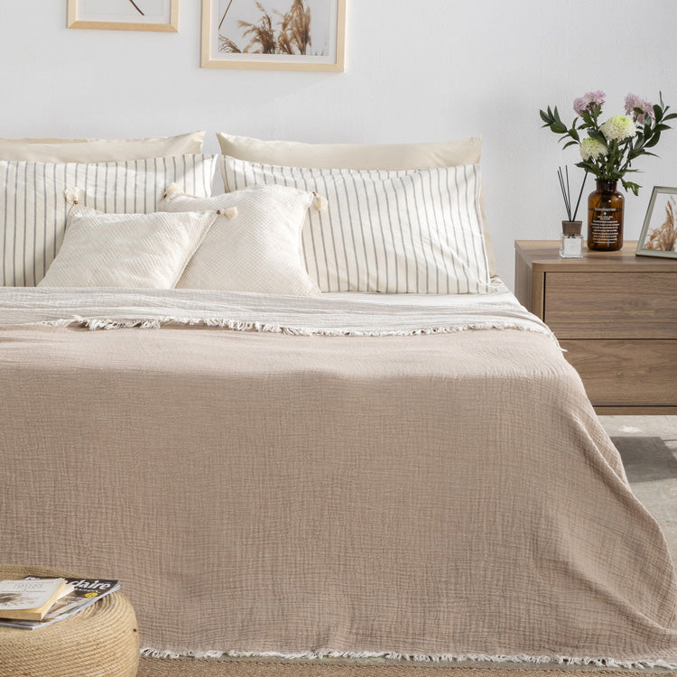 Yıkanmış pamuk ve keten karışımından üretilen bu nevresim seti, doğal kırışıklıklar ve nostaljik bir görünümle şıklık sunuyor. Oeko-tex 100 sertifikalı kumaşı, cildinize zarar vermezken, terletmeyen ve yumuşak dokusuyla konfor sağlıyor. Çift kişilik nevresim ve 2 adet yastık kılıfından oluşan set, yatak odanıza huzur ve zarafet katacak.